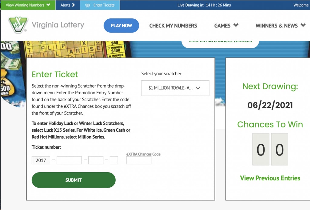 Boom – for no money at all I’ve now just entered 50 or even 100 chances to win. Virginia Lottery enters you for as many chances as the cost of the ticket in many cases, so entering a $10 scratcher gets me 10 chances to have my name drawn for the prize.